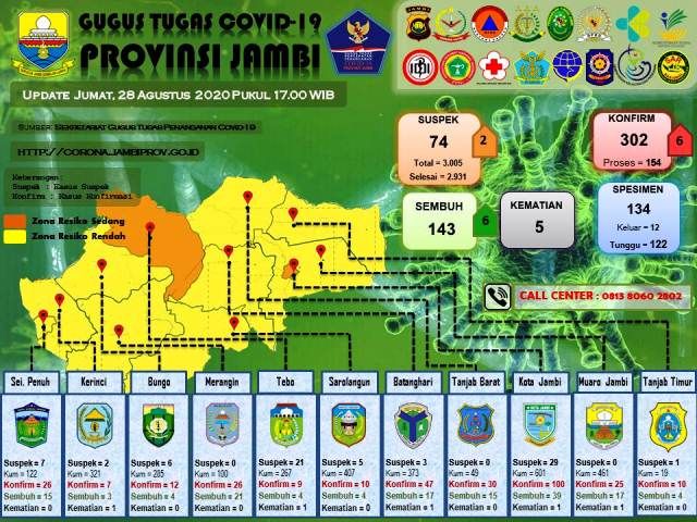 JAMBERITA.COM- Tim gugus tugas penanganan Covid-19 Provinsi Jambi mengumumkan 6 pasien positif yang berasal dari kabupaten Bungo dan Kerinci, Jum'at (28/8/2020).