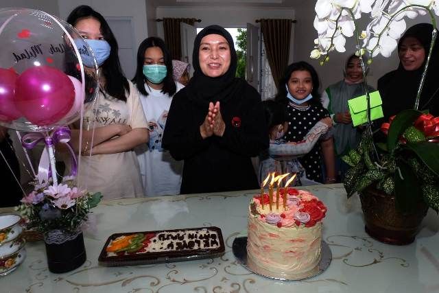 Istri mendiang Zulkifli Nurdin ini tak menyangka mendapatkan kejutan ini. Apalagi semua orang dekatnya sudah berkumpul di kediamannya.