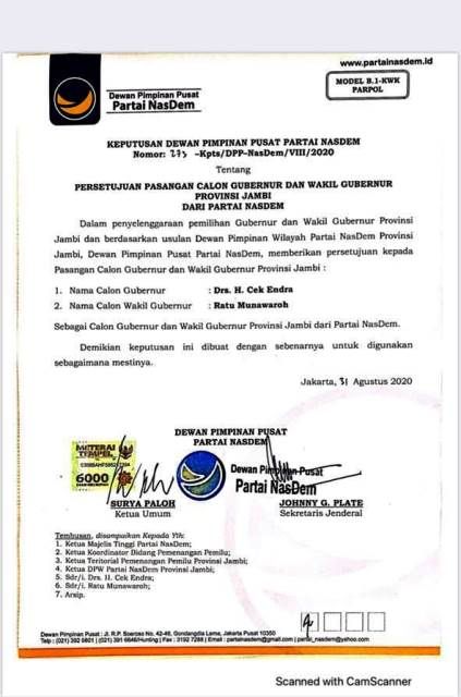 Ini semua dibuktikan dengan foto yang didapat Jamberita.com. Foto tersebut merupakan bentuk B1 KWK yang merupakan syarat pendaftaran ke KPU. Dukungan tersebut dibenarkan oleh tim maupun pihak DPW NasDem Provinsi Jambi.