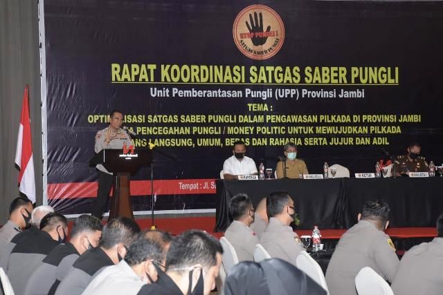 Kabid Humas Polda Jambi, Kombes Pol Kuswahyudi Tresnadi mengatakan ini merupakan konsolidasi satgas dengan tema Optimalisasi Satgas Saber Pungli Dalam Pengawasan Pilkada di Propinsi Jambi Guna Pencegahan Pungli (Money Politic).