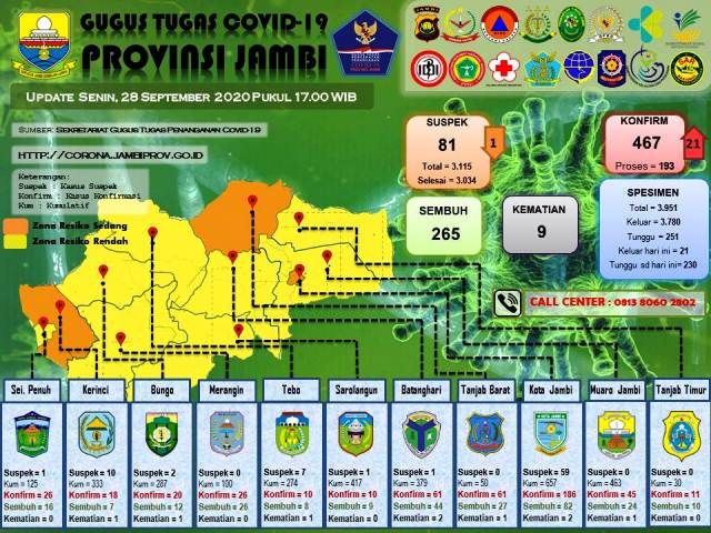 JAMBERITA.COM - Kembali bertambah, jumlah kasus terkonfirmasi positif Covid-19 di Provinsi Jambi menjadi 467 kasus.