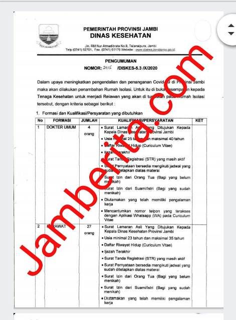Pengumuman tersebut nomor 2415/DISKES-5.3/X/2020 tertanda tangan PLT Kepala Dinas Kesehatan (Kadinkes) Refrizal (2/10/2020) kemarin. Dijelaskannya, itu merupakan dalam upaya meningkatkan pengendalian dan penanganan Covid-19 di provinsi Jambi maka akan dilakukan penambahan rumah isolasi.
