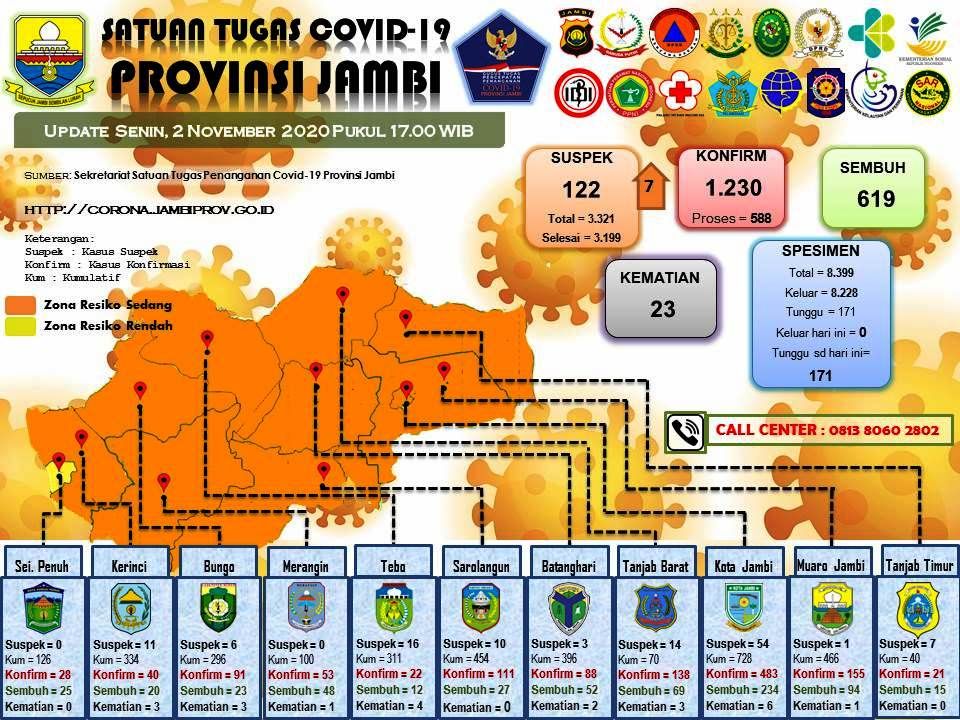Dengan jumlah total keseluruhan kasus di Provinsi Jambi sebanyak 1230 kasus, 23 pasien meninggal dunia, 619 sembuh dan 588 sedang dalam perawatan. (sap)