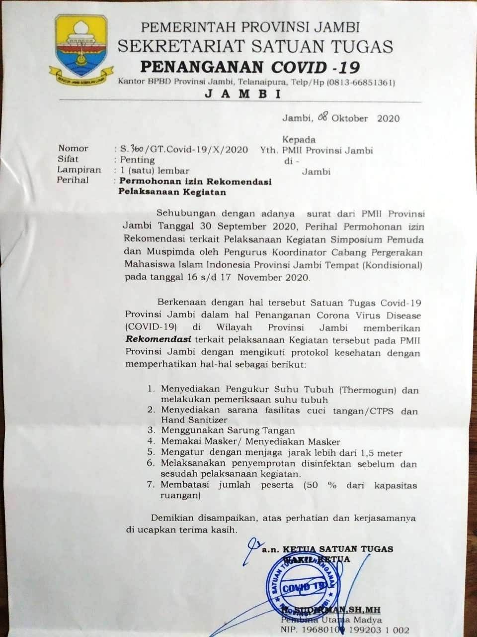 JAMBERITA.COM - Pengurus Koordinator Cabang (PKC) Pergerakan Mahasiswa Islam Indonesia (PMII) Provinsi Jambi akan menggelar Musyawarah Pimpinan Daerah (Muspimda) disertai dengan Simposium Pemuda ditengah kondisi Coviid-19. Pelaksaanaan ini rupanya sudah mendapatkan persetujuan dari Gugus Tugas Provinsi Jambi.