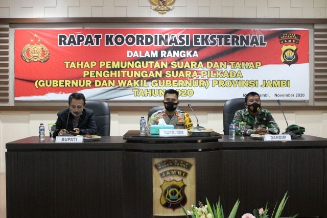 JAMBERITA.COM - Kapolres Muaro Jambi AKBP Ardiyanto menggelae rapat Koordinasi Eksternal dalam rangka tahapan pemungutan suara dan tahap penghitungan suara Pilkada ( Gubernur dan Wakil Gubernur) Jambi tahun 2020, (28/11).