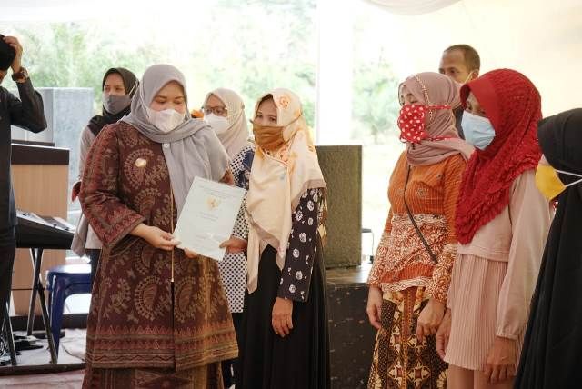 JAMBERITA.COM - Bupati Muaro Jambi Masnah menyerahkan sertipikat tanah kepada masyarakat penerima di Desa Talang Kerinci.