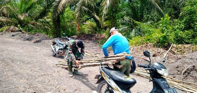 JAMBERITA.COM – Berat sama dipikul ringan sama dijinjing, itulah kata Prada Ade, saat melakukan gotong royong bersama warga Desa Sungaiterap, dalam mengumpulkan kayu untuk dibuatkan galar, Jumat (19/3/2021).