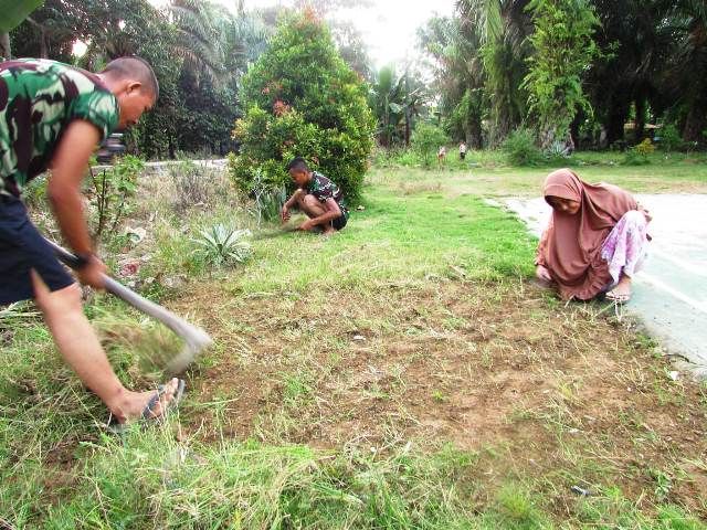 JAMBERITA.COM- Satgas TMMD ke 110 Kodim 0415/Batanghari bantu orang tua asuh dalam membersihkan lapangan badminton, Jumat (19/3/2021) pagi.