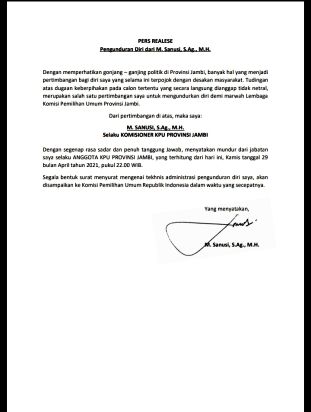 JAMBERITA.COM- Jelang Pemungutan Suara Ulang (PSU) Pilgub Jambi 27 Mei, beredar Surat pengunduran diri Komisioner KPU Provinsi Jambi M Sanusi di jagat maya. Dalam surat tersebut, pengunduran komisioner dua periode ttertanggal 29 April2021 dan menyatakan mundur sejak pukul 22.00.