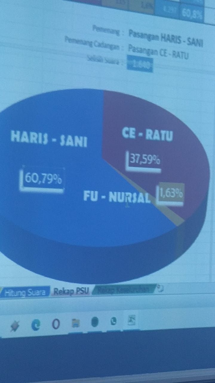 Dimana Haris-Sani meraih 60, 79 persen, sementara CE-Ratu meraih 37, 59 persen. Sedangkan pasangan nomor urut 02 meraih 1,63 persen suara.