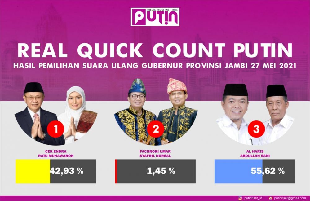 Hasil real quick count PUTIN ini disampaikan oleh Dr. Pahrudin HM, M.A. selaku Direktur Eksekutif dan Hatta Abdi Muhammad, M.IP sebagai Direktur Riset di Hotel Shang Ratu 27 Mei 2021 jam 18.00 wib. Hasilnya, pasangan 03 Al Haris-Sani unggul sebesar 55,62 persen, diikuti oleh pasangan 01 Cek Endra-Ratu sebesar 42,93 persen dan pasangan 02 Fachrori-Syafrial sebesar 1,45 persen.