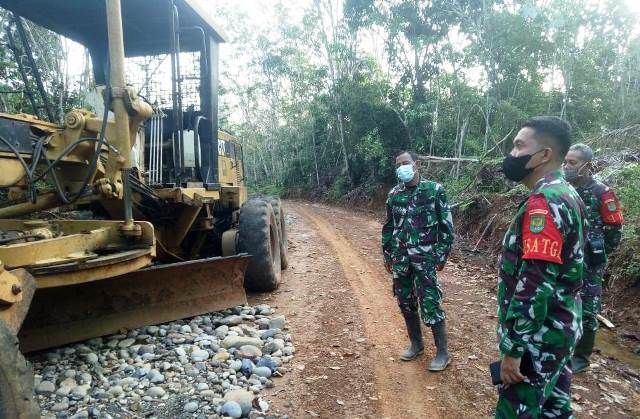 Didampingi Perwira Seksi Teritorial (Pasi Ter) Kapten Inf Suhadi bersama Danunit Letda Inf Hengki, Dansatgas menuju lokasi pengerjaan jalan yang di sambut langsung oleh koordinator Kapten Inf Suhari.