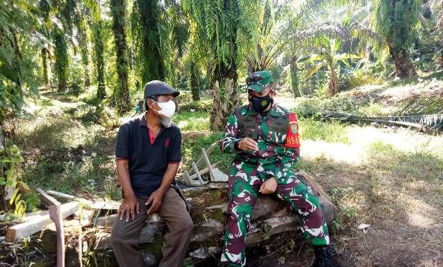 Melihat Sutaryo (59) warga Desa Bukit Beringin Kecamatan Bangko Barat Kabupaten Merangin Provinsi Jambi, istirahat sejenak di kebun sawitnya, Dansatgas menghentikan laju kendaraannya dan menghampiri warga tersebut, Sabtu(10/7/2021).