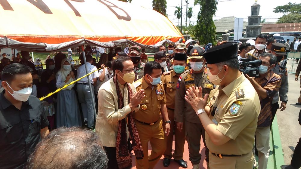 "Halo, apa kabar sudah divaksin belum,?" tanya Nadiem kepada siswa-siswi yang menunggu dalam kegiatan serbuan vaksin massal di Makorem, Selasa (21/9/2021).