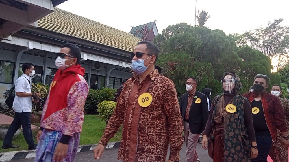 Kepala OPD, asisten serta camat di lingkungan Pemerintah Kota Jambi mengenakan pakaian batik Jambi dan berlenggok seperti model.