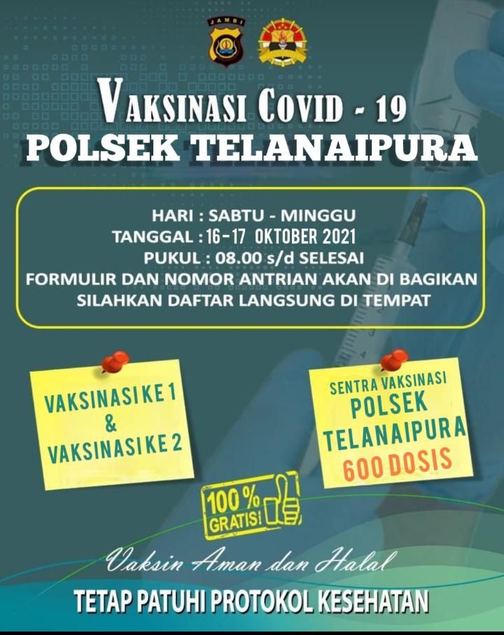 JAMBERITA.COM - Kepolisian Sektor (Polsek) Telanaipura melaksanakan vaksinasi Covid-19 di area Kantor. Vaksinasi ini sendiri digelar pada hari ini, Minggu (17/10/2021) dan sehari sebelumnya.