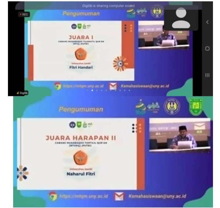 JAMBERITA.COM- Mahasiswa Unja berhasil menorehkan prestasi pada ajang Musabaqah Tilawatil Quran Mahasiswa Nasional (MTQMN) yang diselenggarakan oleh Universitas Negeri Yogyakarta (UNY), yang di selenggarakan pada tanggal 28 Januari sampai 5 Maret 2022. Kontingen Universitas Jambi mendapatkan prestasi dengan mengirim 2 finalis dari 10 cabang yang dilombakan.