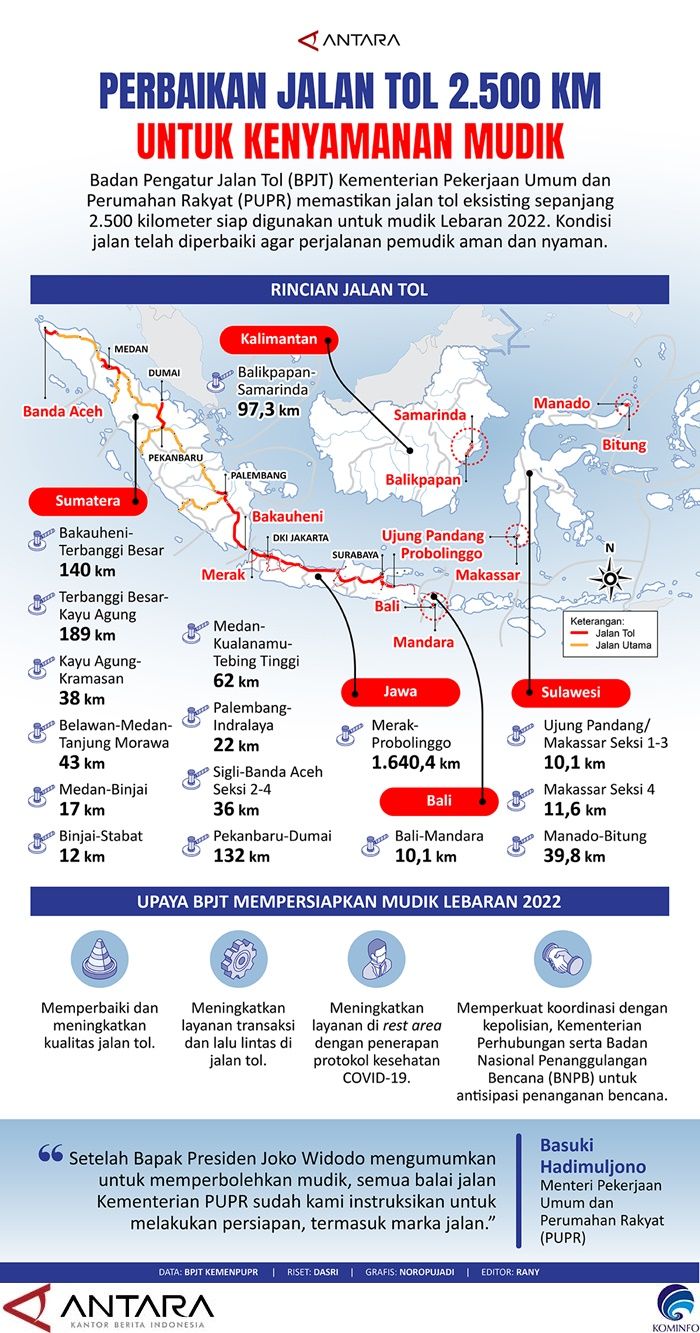 Badan Pengatur Jalan Tol (BPJT) Kementerian Pekerjaan Umum dan Perumahan Rakyat (PUPR) memastikan jalan tol eksisting sepanjang 2.500 kilometer siap digunakan untuk mudik Lebaran 2022. Kondisi jalan telah diperbaiki agar perjalanan pemudik aman dan nyaman.