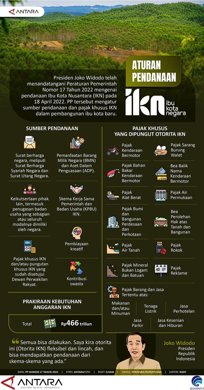 Presiden Joko Widodo telah menandatangani Peraturan Pemerintah Nomor 17 Tahun 2023 mengenai pendanaan Ibu Kota Nusantara (IKN) pada 18 April 2022. PP tersebut mengatur sumber pendanaan dan pajak khusus IKN dalam pembangunan ibu kota baru.