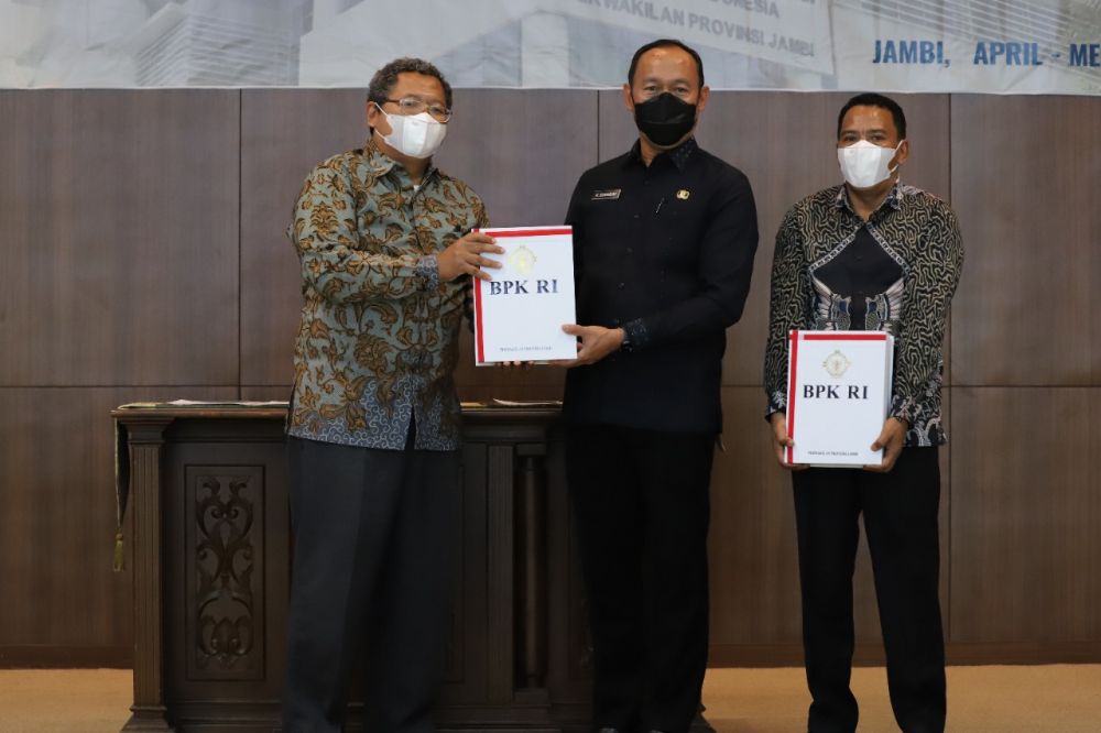 JAMBERITA.COM - Badan Pemeriksa Keuangan (BPK) BPK Perwakilan Provinsi menyerahkan Laporan Hasil Pemeriksaan (LHP) atas Laporan Keuangan Pemerintah Daerah (LKPD) Tahun Anggaran (TA) 2021 kepada Pemerintah Kabupaten Tebo, Kamis (12/5/2022).