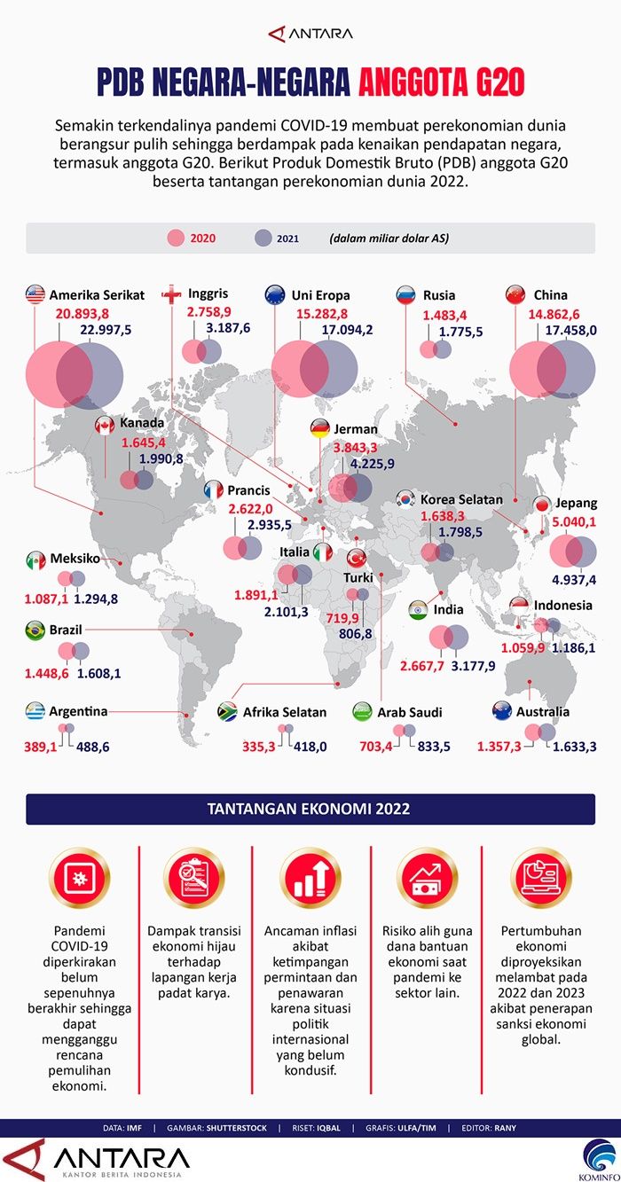 Semakin terkendalinya pandemi COVID-19 membuat perekonomian dunia berangsur pulih sehingga berdampak pada kenaikan pendapatan negara, termasuk anggota G20. Berikut Produk Domestik Bruto (PDB) anggota G20 beserta tantangan perekonomian dunia 2022.
