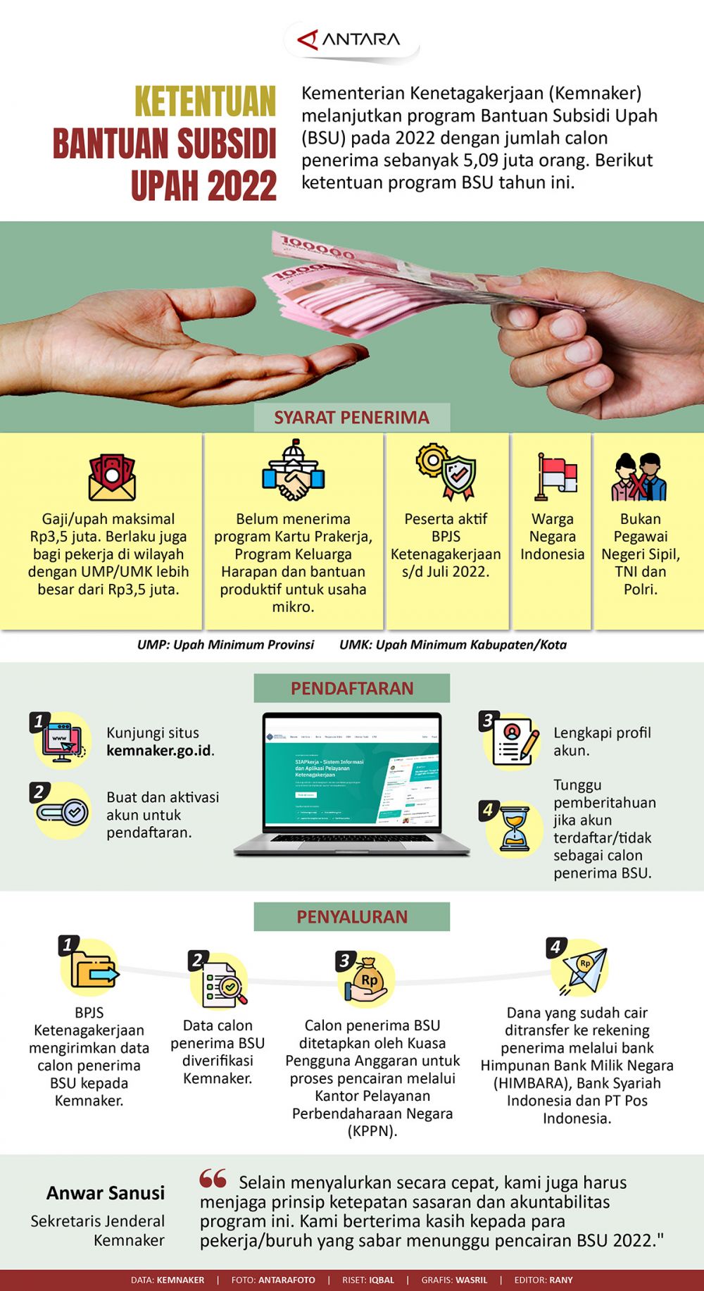 Kementerian Kenetagakerjaan (Kemnaker) melanjutkan program Bantuan Subsidi Upah (BSU) pada 2022 dengan jumlah calon penerima sebanyak 5,09 juta orang. Berikut ketentuan program BSU tahun ini.