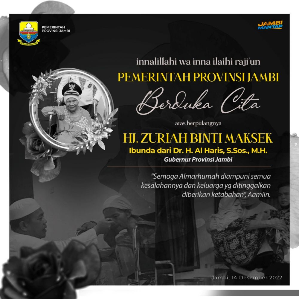 "Saya pribadi, keluarga dan atas nama pemerintah Provinsi Jambi turut berduka yang mendalam atas meninggalnya Hj Zuriah, ibu tercinta Gubernur Jambi, " kata Sudirman, Rabu (14/12/2022).