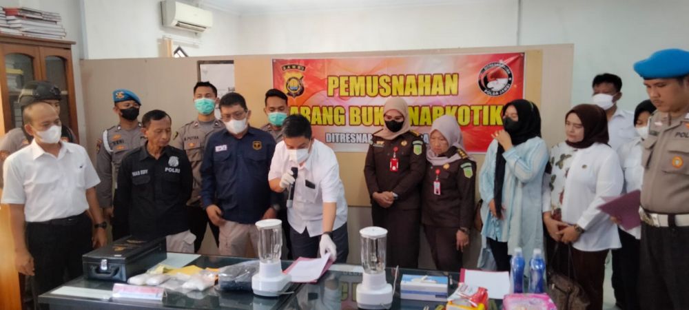 JAMBERITA.COM- Direktorat Reserse Narkoba (Ditresnarkoba) Polda Jambi melakukan pemusnahan barang bukti narkotika jenis sabu sebanyak 1,3 kilogram dengan cara diblender dicampur dengan air dan cairan pembersih lantai.