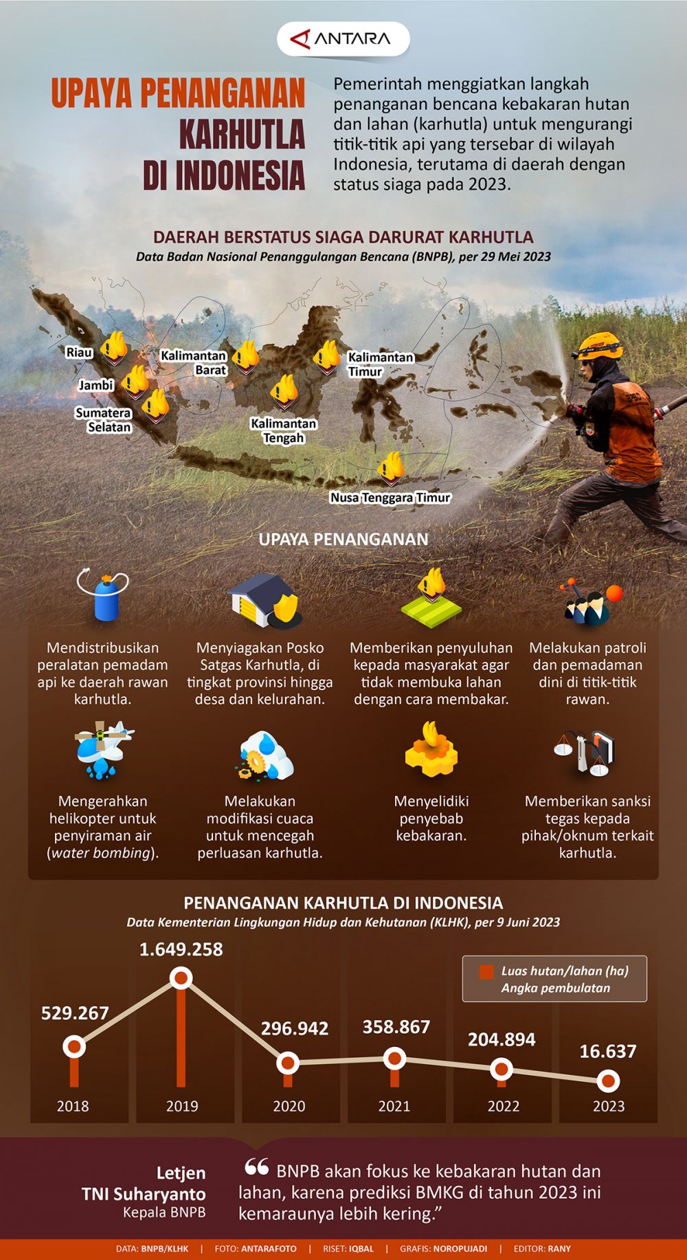 Pemerintah menggiatkan langkah penanganan bencana kebakaran hutan dan lahan (karhutla) untuk mengurangi titik-titik api yang tersebar di wilayah Indonesia, terutama di daerah dengan status siaga pada 2023.