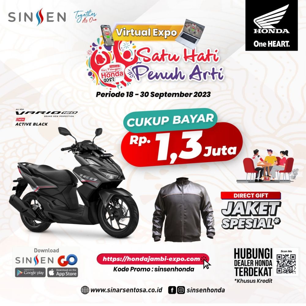 Program menarik di Honda Virtual Expo Satu Hati Penuh Arti kali ini berupa free jaket spesial dan DP ringan cukup bayar Rp 1,3 Juta saja khusus pembelian Honda Vario 160 dengan syarat dan ketentuan berlaku.