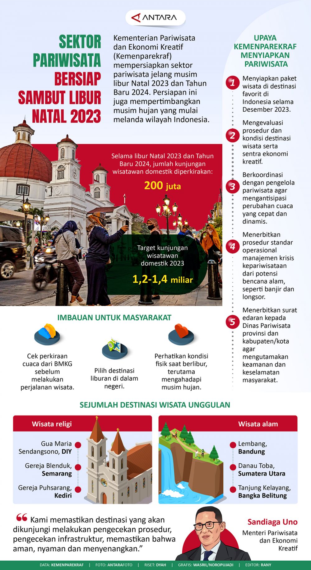 Kementerian Pariwisata dan Ekonomi Kreatif (Kemenparekraf) mempersiapkan sektor pariwisata jelang musim libur Natal 2023 dan Tahun Baru 2024. Persiapan ini juga mempertimbangkan musim hujan yang mulai melanda wilayah Indonesia