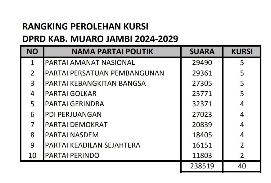 Ada 10 partai yang akan mengisi jatah 40 Anggota DPRD Muarojambi. Ke 10 partai yang berharsil meloloskan wakilnya ke DPRD Muaro Jambi itu yakni PAN, PPP, PKB, Golkar, PDIP Gerindra, Demokrat, NasDem, Perindo dan PKS.