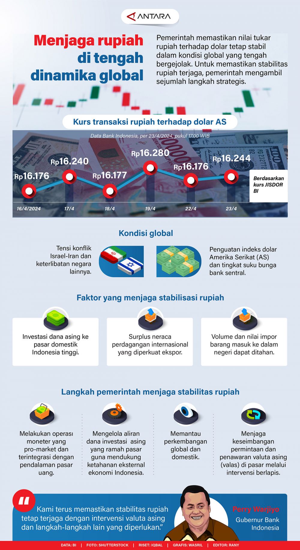 Pemerintah memastikan nilai tukar rupiah terhadap dolar tetap stabil dalam kondisi global yang tengah bergejolak. Untuk memastikan stabilitas rupiah terjaga, pemerintah mengambil sejumlah langkah strategis.