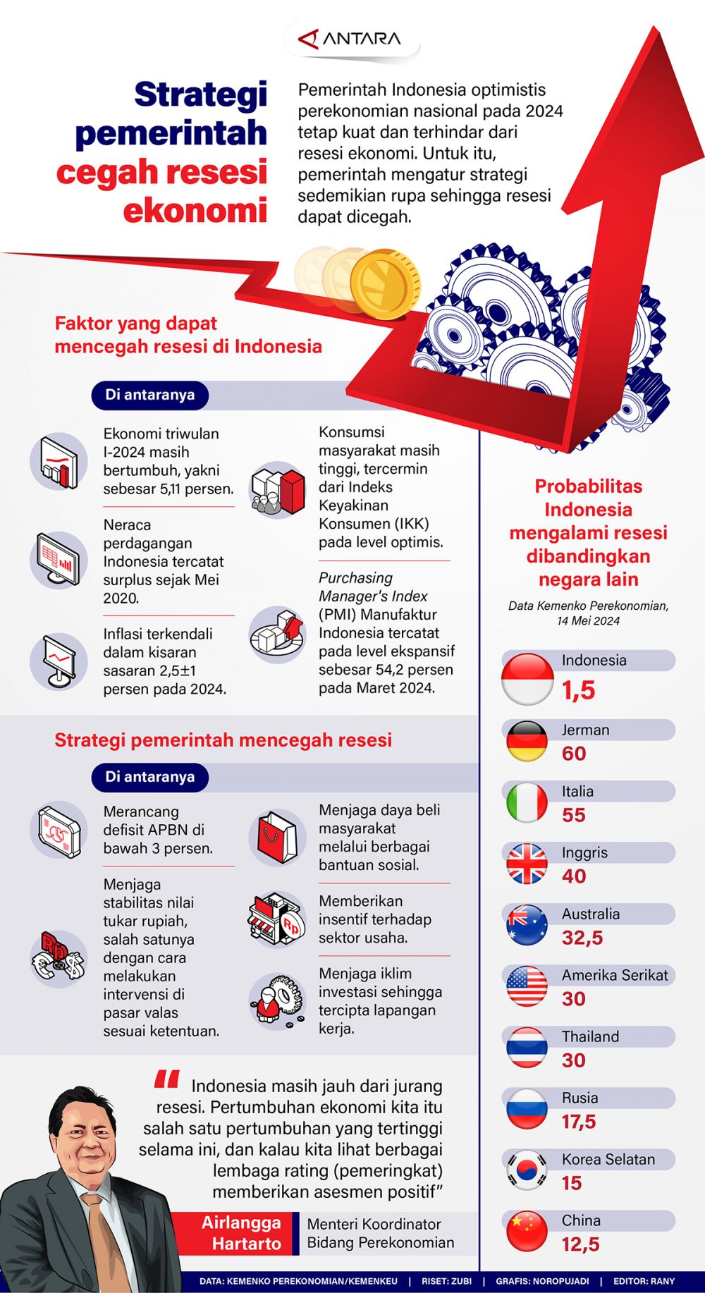 ANTARA- Pemerintah Indonesia optimistis perekonomian nasional pada 2024 tetap kuat dan terhindar dari resesi ekonomi. Untuk itu, pemerintah mengatur strategi sedemikian rupa sehingga resesi dapat dicegah.