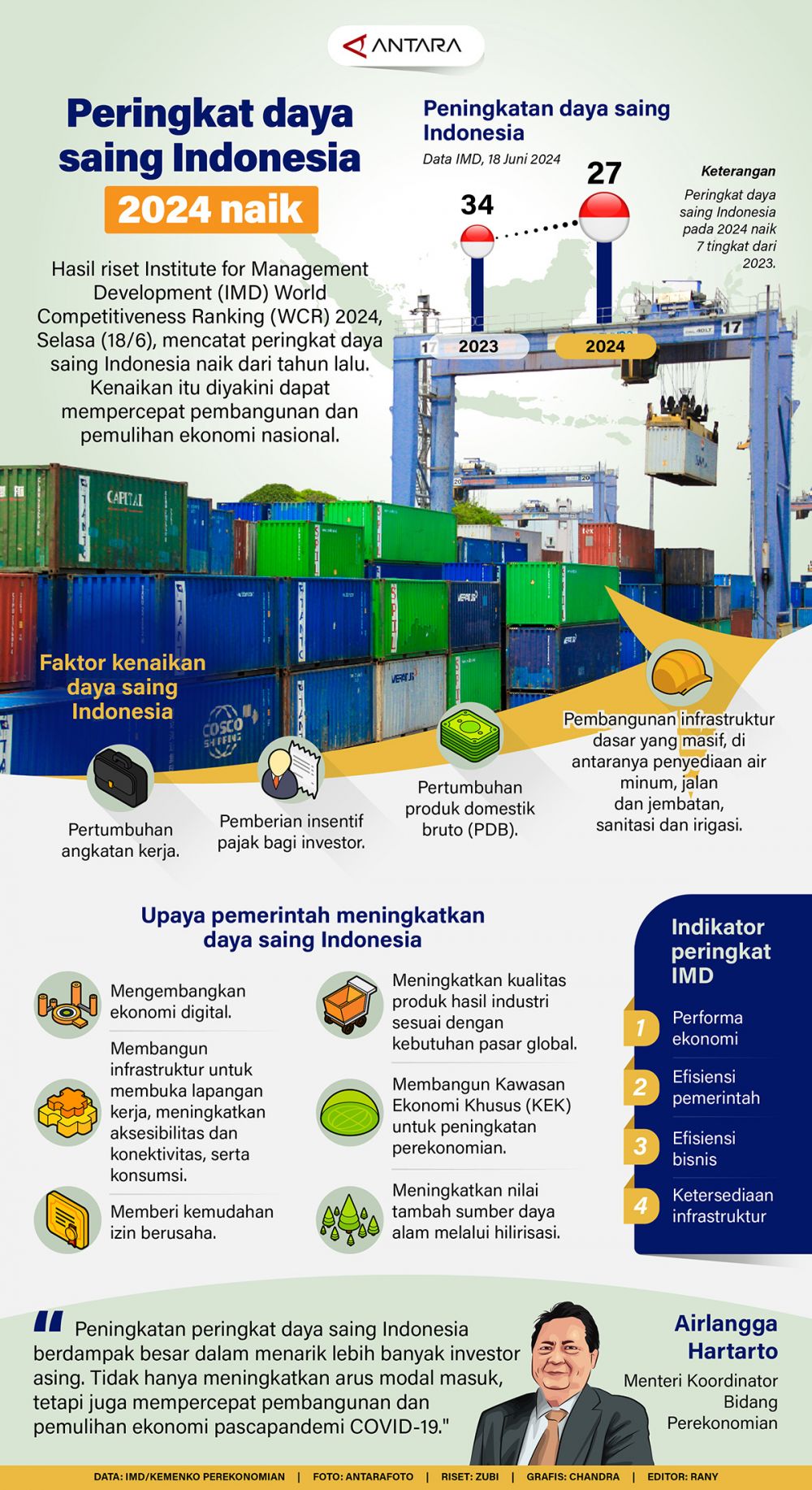 Hasil riset Institute for Management Development (IMD) World Competitiveness Ranking (WCR) 2024, Selasa (18/6), mencatat peringkat daya saing Indonesia naik dari tahun lalu. Kenaikan itu diyakini dapat mempercepat pembangunan dan pemulihan ekonomi nasional.(antara)