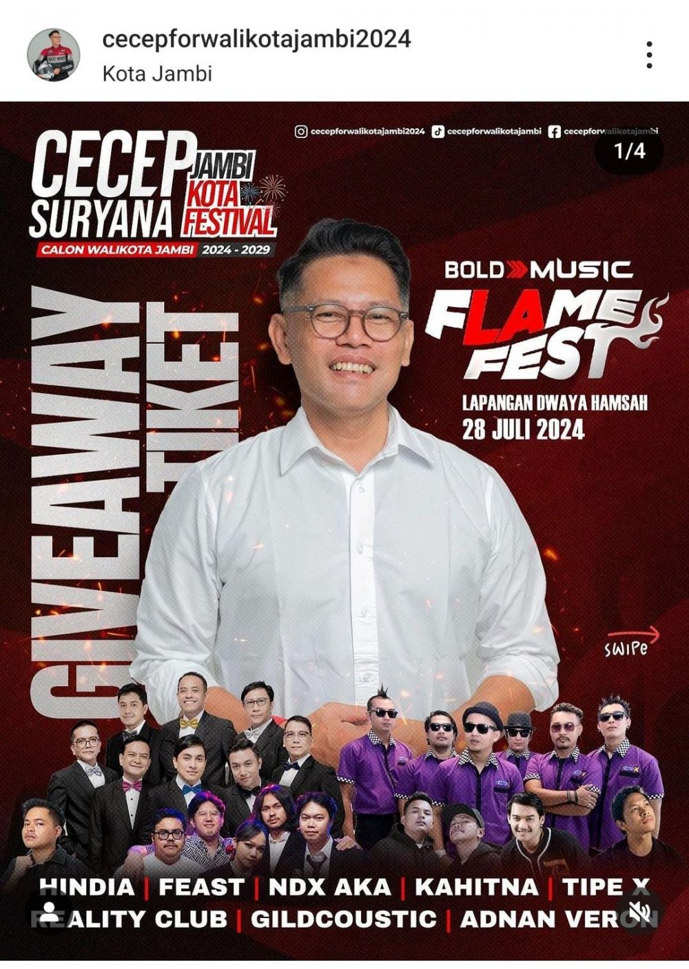 Karena itu, Calon walikota Jambi Cecep Suryana akan bagi-bagi Give away ratusan tiket gratis untuk menonton grup kenamaan pada 28 Juli mendatang.