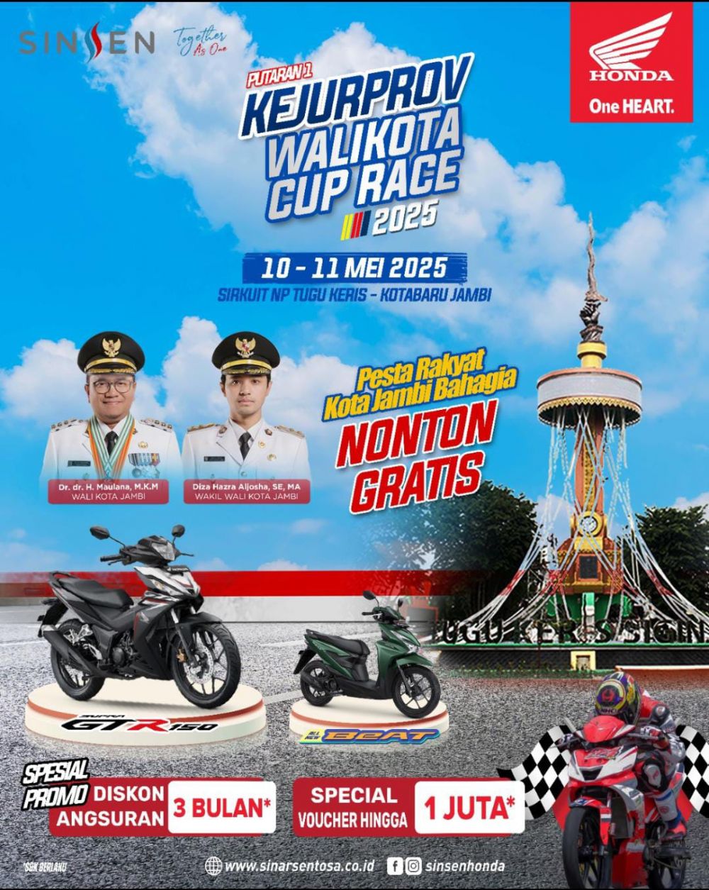 “Kami sangat senang dapat mendukung langsung Kejurprov Walikota Cup Race 2025 yang menjadi bagian dari perayaan besar bagi Kota Jambi. Ayo masyarakat Jambi, datang dan saksikan langsung keseruan aksi para rider terbaik secara gratis. Jangan lewatkan pula berbagai promo menarik yang kami hadirkan khusus untuk Anda” ujar Hendy.