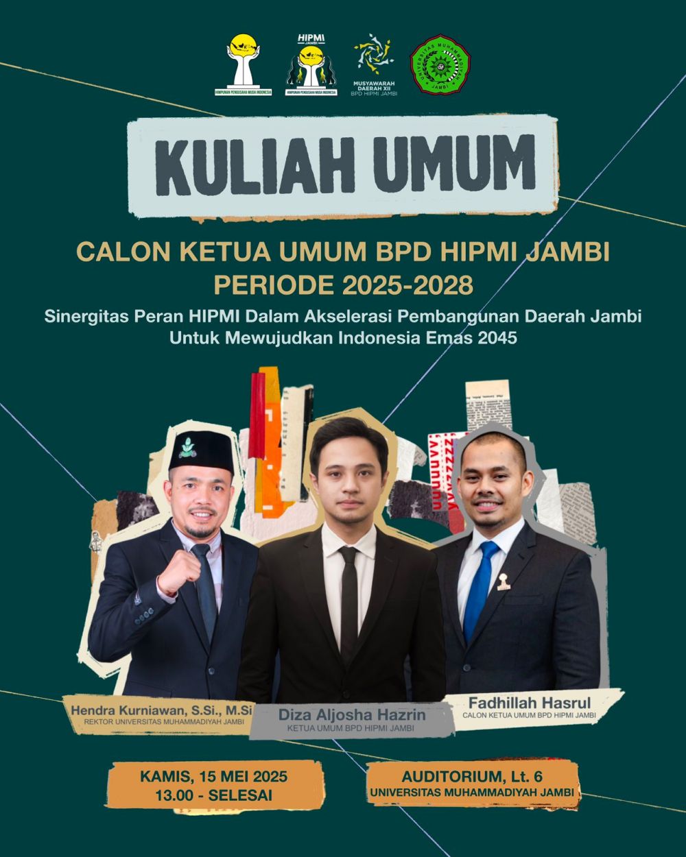Agenda Kuliah Umum Calon Ketua Umum BPD HIPMI Jambi Periode 2025-2028 akan di adakan pada hari Kamis, tanggal 15 Mei 2025, Pukul 13.00 WIB – Selesai di Auditorium Lantai 6, Universitas Muhammadiyah Jambi