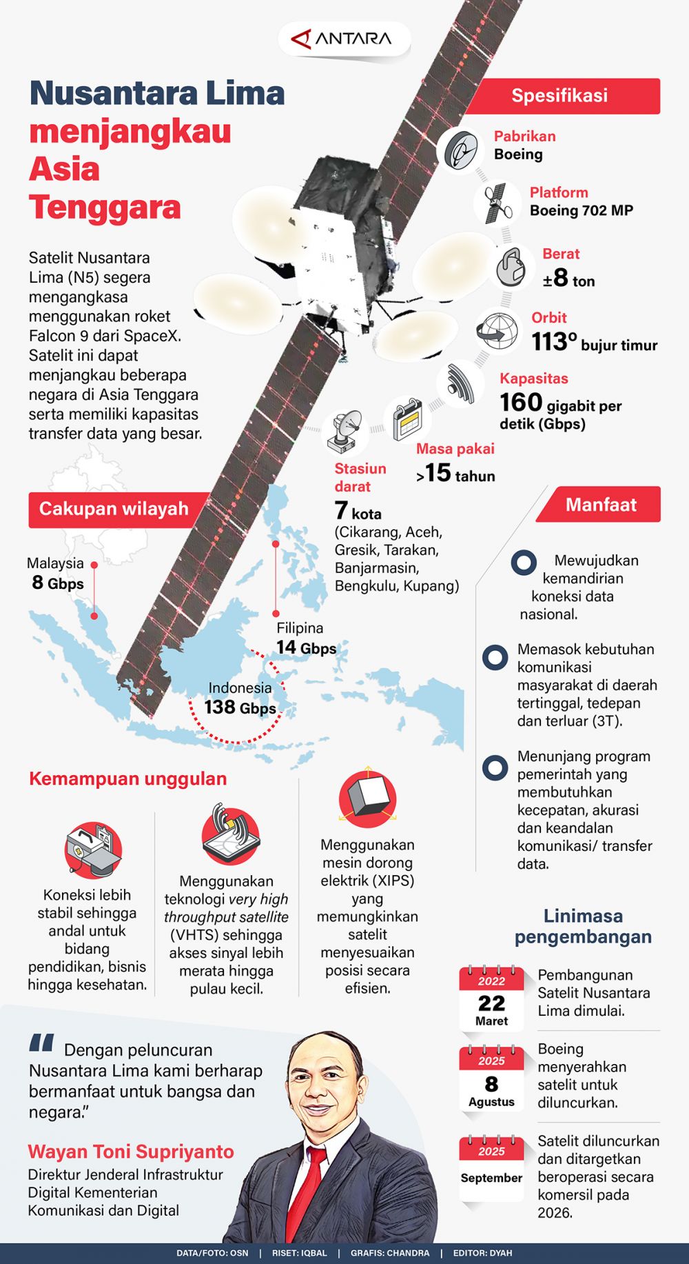 Satelit Nusantara Lima (N5) segera mengangkasa menggunakan roket Falcon 9 dari SpaceX. Satelit ini dapat menjangkau beberapa negara di Asia Tenggara serta memiliki kapasitas transfer data yang besar.