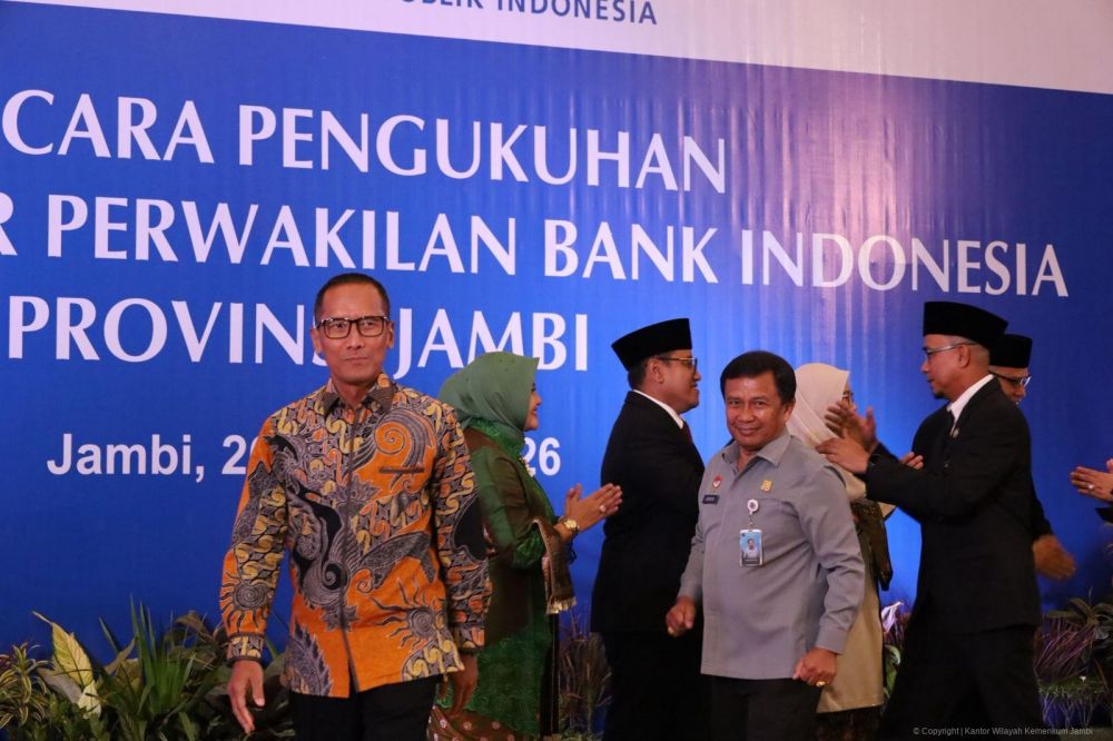 JAMBERITA.COM - Kepala Kantor Wilayah Kementerian Hukum Jambi, Jonsosn Siagian menghadiri Prosesi pengukuhan Kepala Kantor Perwakilan Bank Indonesia Provinsi Jambi. Gubernur Bank Indonesia (BI), Perry Warjiyo secara resmi mengukuhkan Tedy Arif Budiman sebagai Kepala Kantor Perwakilan Bank Indonesia Provinsi Jambi. Prosesi pengukuhan berlangsung khidmat di Swiss-Belhotel Jambi, Senin (26/01/2026) turut disaksikan langsung oleh Gubernur Jambi Al Haris.