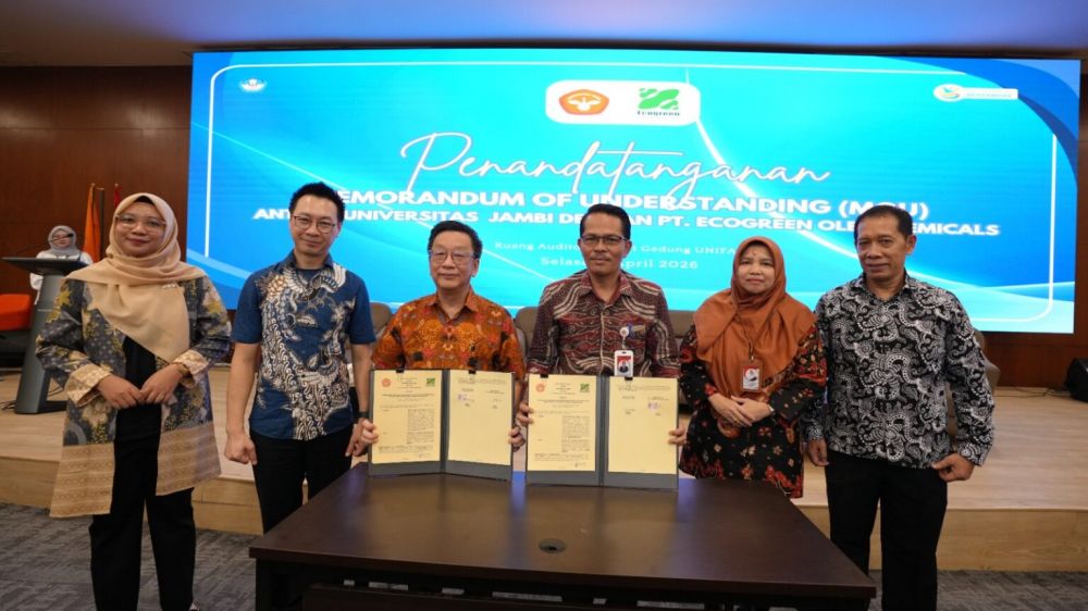 JAMBERITA.COM - Universitas Jambi (UNJA) resmi menjalin kerja sama dengan PT Ecogreen Oleochemicals melalui penandatanganan Memorandum of Understanding (MoU) yang berlangsung di Ruang Auditorium Lantai 1 Gedung UNIFAC, Selasa (07/04/2026).